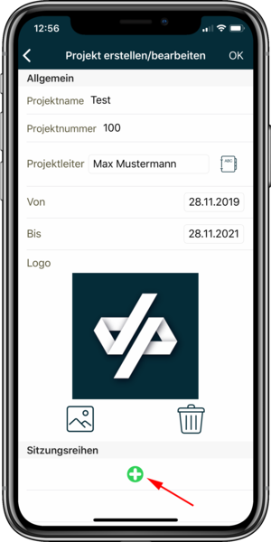 With a "click" on the green + you create a session row. Important: You can only create a series of sessions if a project has been entered.